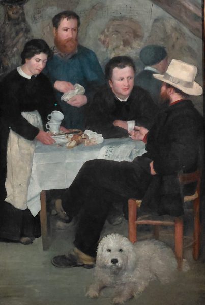 Les artistes se réunissaient à Marlotte près de la forêt de Fontainebleau. On reconnaît Sisley (de dos) à son chapeau, Murger est caricaturé sur le mur avec un chapeau melon, le personnage imberbe n’est sans doute pas un peintre. Le Cabaret est un grand tableau mis à l’honneur. Autour on a acroché la Grenouillère et une jolie vue de Bougival et la Promenade (voi plus haut)