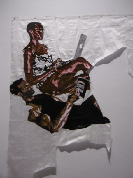 Ana Silva, Angola, a brodé des femmes en fines broderies sur de la toile à sac servant à emballer des vêtements de seconde main arrivant en Afrique : dénonciation de la surconsommation de l’industrie de la mode.