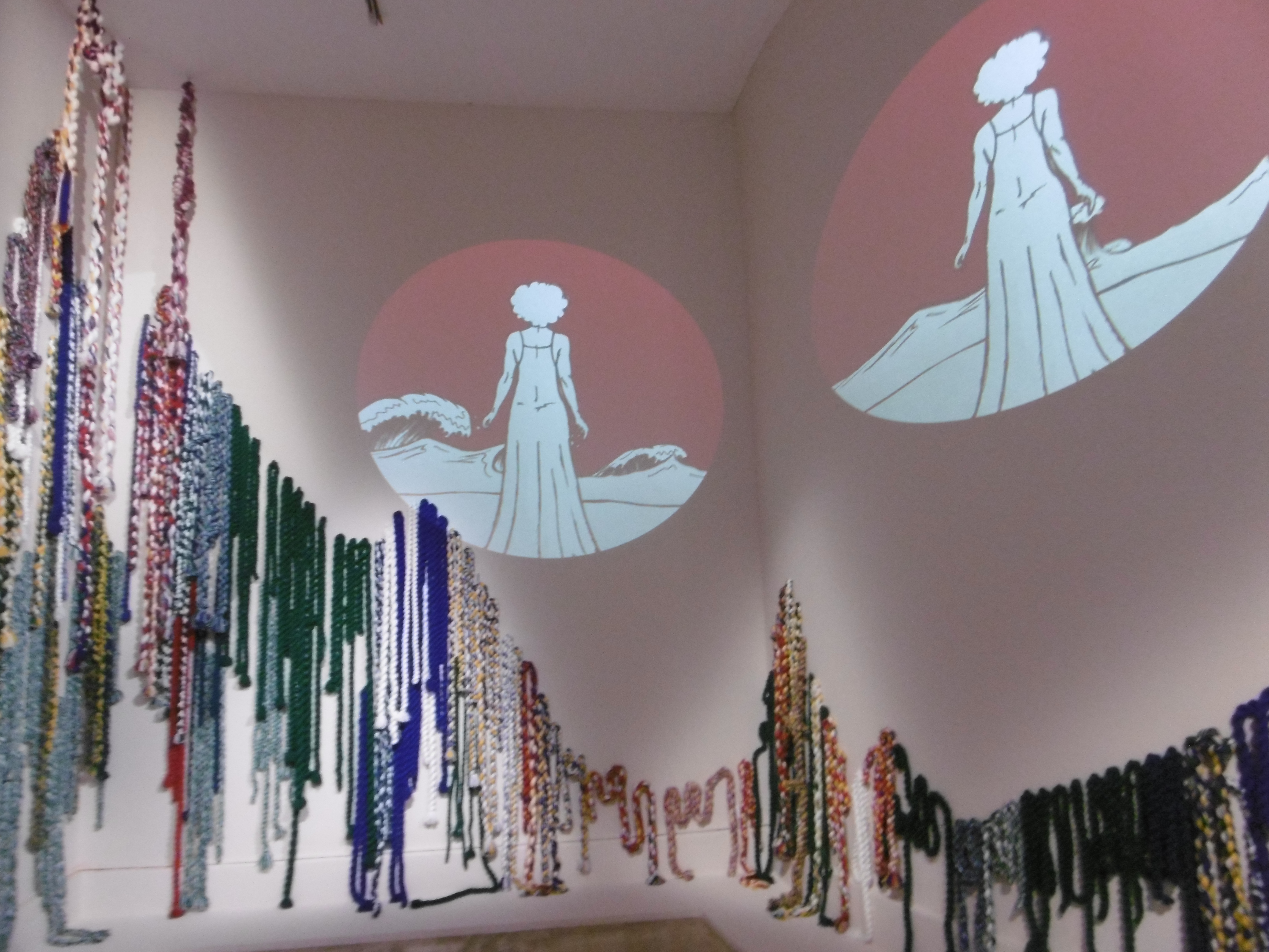 En effet ces plasticiennes utilisent les textiles, la terre, et même les tresses de faux cheveux des coiffures africaines . Mais j’ai aussi été bluffée par la modernité de ces œuvres qui utilisent largement la photographie et la vidéo.