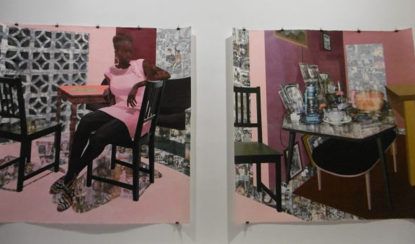 Les techniques utilisées sont souvent métissée, composites avec surimpression photographiques et très sophistiquées. l’artiste nigériane vit à Los Angeles,.