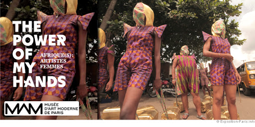 j’ai beaucoup aimé la vidéo de Wura Natasha Ogunju(USA/Nigéria) dont est tirée l’affiche de l’exposition : Will I still carry water when I am a dead woman? Des femmes au visage masqué mais à la tenue courte, short ou robe courte trainent des bidons dorés qui les entravent. Elles défilent dans les rues d’une ville nigériane dans l’indifférence des passants.