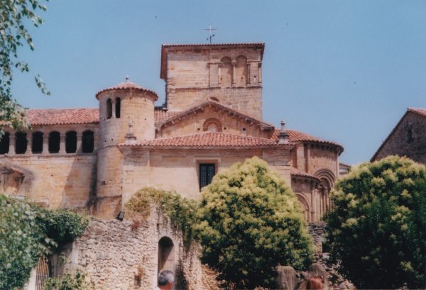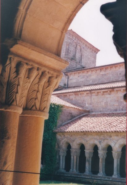 Passé le col, tout s’éclaire, il fait beau. La campagne est riante, les maisons couvertes de tuiles romaines sont fleuries dans des champs de maïs, de haricots bien ramés, d’autres de plantes potagères. Nous suivons tranquillement la route 632, la même que depuis Bilbao. La coquille bleue et jaune de chemin de Saint Jacques (On dirait un soleil avec des rayons inégaux !) indique le chemin des Pèlerins qui suit parfois des chemins creux bordés de dalles plates alignées verticalement. Nous sommes en pays de granite . Des eucalyptus sont plantés serrés, les châtaigniers sont en fleur. L’Espagne apparaît ici très sauvage, peu cultivée, couverte de forêts denses.