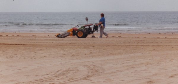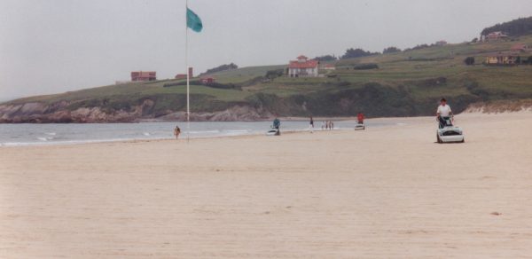 Nous retournons sur la plage d’Oyambre découverte hier. Ce n’est pas une plage déserte et vierge comme je l’avais cru ! Les équipes de la « recuperacion » sont à l’œuvre. D’abord un tracteur et sa pelle ramasse les algues puis les cribleuses passent. Elles ressemblent à de grosses tondeuse à gazon ou à de petits motoculteurs : une lame tourne et envoie le sable dans un tamis. Ensuite les piétons en combinaisons blanches, gants et bottes de caoutchouc, râteaux, pelles ou truelle à la main, creusent, farfouillent et remplissent des sacs poubelles de sable souillé. J’essaie d’interviewer l’un d’eux.