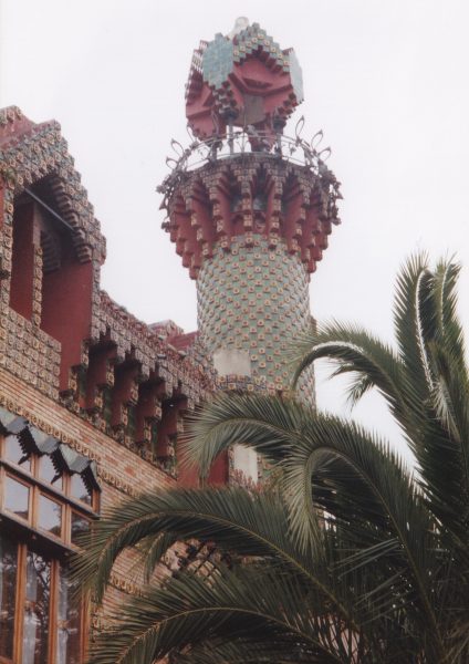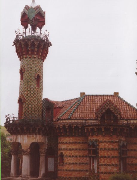 Capricho de Gaudi : villa délirante recouverte de céramique décorée rose, vert, jaune. Chaque carreau jaune est orné d’un tournesol, les verts de plusieurs feuilles. Les ferronneries végétales ressemblent à celles de Guimard. Des chapiteaux sont sculptés de palmes et d’oiseaux. Une tour cylindrique en forme de minaret coiffe le tout.