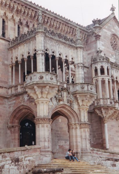 Un peu plus loin, une chapelle gothique et le château (1880) du marquis de Comillas Lopez y Lopez.La végétation est luxuriante : hortensias, agapanthes bleus, magnolias, hauts lauriers et marronniers. Le château kitsch ressemble un peu à celui de Cintra. Nous visitons le château. MartorelletGaudi ont collaboré à ce manoir prétentieux d’un marquis nouveau riche (nouveau marquis) fier d’accueillir le roi Alphonse XII Vitraux, billard surdimensionné, salle de réception décorée de fresque représentant la visite du souverain et l’inauguration de l’Université Pontificale (travail de Martorell), encore du gothique catalan fin XIXème.