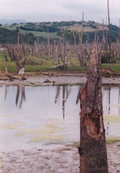 Sur la route de San Vicente de la Barquera : réserve naturelle ornithologique. Une ria fait des méandres, les vasières sont un refuge pour les oiseaux. Des troncs écorcés gris argentés sortant de l’eau nous rappellent les barrages à castors du Canada. Qu’est ce qui a fait mourir les arbres ? Nous nous promenons en lisière d’un golf. Un geai prend la fuite à notre approche. De jolis passereaux à tête noire volettent. La promenade tourne court. Le golf nous barre l’accès. Fleurs bleues et jaunes des marais.