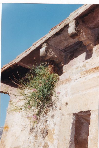 A la sortie du défilé nous quittons la route pour visiter la petite église de Santa Maria de Lebena du Xème siècle de style mozarabe, toute petite cachée dans la verdure. Le campanile, récent, a été rajouté il y a 100ans. Sous la toiture, de curieuses parures : les modillons à copeaux. La visite est guidée : nous sommes les seules visiteuses, la dame me raconte donc en espagnol toutes les légendes de l’église. Je décroche par moments, mais c’est une leçon particulière d’espagnol.