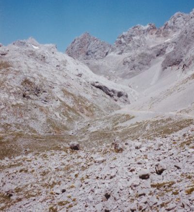 Le parking du téléphérique de Fuente De est déjà bien plein. De jolis veaux gris paissent en face des voitures. La cabine rouge monte très vite le long de la paroi minérale. Arrivées en haut la vue est magnifique mais une foule marche en procession sur un large chemin. Horreur, des 4×4 l’empruntent ! Nous suivons le mouvement général jusqu’à un embranchement. A droite le chemin descend surplombant une vallée très verte, à gauche il s’engage dans un pierrier et monte vers les sommets 2600m. Nous sommes à la limite de la végétation (à Superdévoluy, ce serait le haut du Sommarel).