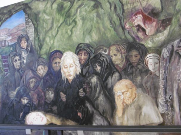Je pourrais rester des heures devant ce tableau, chercher les détails que l’auteur a cachés, décrire les couleurs, découvrir dans l’ouverture de la grotte verte les tombes du cimetière. Dan le village aux maisons blanches détailler chaque femme qui nourrit ses enfants, comparer le retour des paysans sur l’âne à une fuite en Egypte….