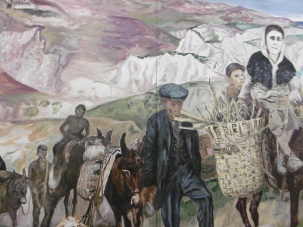 Je n’ai pas renoncé à visiter la Casa di Ortega bien cachée dans le Sasso Barisano en-dessous de la cathédrale que ne n’ai aucune difficulté à trouver. Ensuite, cela se complique, sous les directives de Googlemaps je descends des dizaines de marches, par la Via San Potito, le Recinto San Giacomo me retrouve sur la corniche de la Civita où nous avons déjeuné hier., je remonte pour reprendre le guidage de Googlemaps qui m’envoie dans une ruelle étroite et noire barrée par des planches. Le même monsieur qui m’avait conseillé de retourner à la Cathédrale insiste « A la Cathédrale ! ». je traverse le parvis, trouve un escalier caché. Je tourne dans le Sasso Barisano depuis une bonne demi-heure. Elle est bien cachée la Casa Ortega ! D’ailleurs je suis la seule visiteuse. La jeune femme de la billetterie me tend un dépliant avec les miniatures et les titres des tableaux : « ici ce n’est pas un musée, c’est la maison de l’artiste, vous ne trouverez pas de cartel ni d’explication ». Puis elle présente l’artiste : Jose Garcia Ortega est né en 1921 en Castille. Accusé d’activité antifranquiste, il est condamné à 10 ans de prison, puis acquitté, il est forcé à l’exil à Paris. Arrivé par hasard à Matera en 1972 après que les sassi aient été vidés, il s’attache à cette ville dont la lumière et les couleurs lui rappellent la Manche où il est né. Avec un ami, il fait l’acquisition de cette belle maison et la décore. Deux cycles de tableaux, Passarono et Morte e Nascita degli Innocenti racontent la Guerre d’Espagne, les luttes antifascistes. La décoration de la maison est intéressante : majolique et azulejos dans la cuisine, je me crois en Espagne, salle de bain avec des carreaux modernes. Il y a même une chapelle peinte dans le Palazzo, » lombarde » dit la dame.