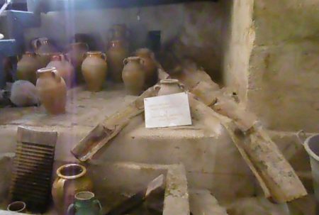 Une maquette montre que la roche était creusée comme un gruyère, des structures verticales montre comment l’eau de ruissellement était captée. Une Casa Cisterna, meublée comme dans les années 50 laisse voir deux grosses citernes rondes et les conduites de la récolte d’eau. Il y avait également un petit moulin et on peut voir la mangeoire des animaux au fond de la grotte.