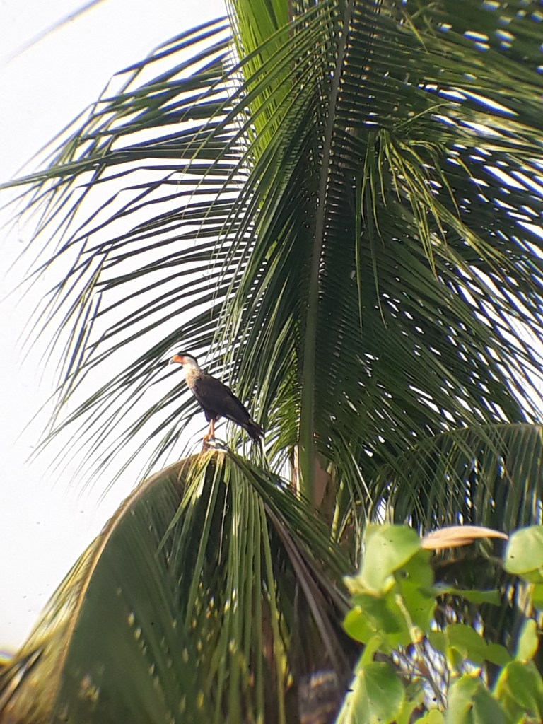 En face de la plage où nous débarquons le relief est plat. On se rechausse. Roy nous emmène vers le haut de la plage où se trouvent des aigrettes blanches, un faucon Black hawk est perché, non loin le Crested Caracara – un rapace dont le nom est inspiré de son cri en vol – . Près d’une lagune en retrait, un Petit Green heron( Butorides virescens) qui n’est pas si vert qu e cela mais qui est le plus petit des hérons. Seul son bec ressemble aux hérons que je connais.