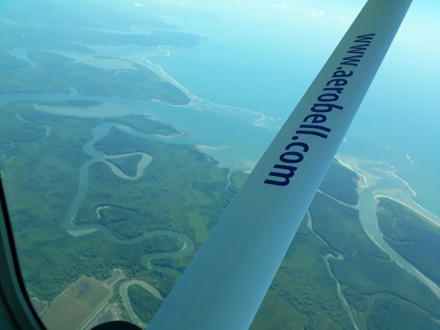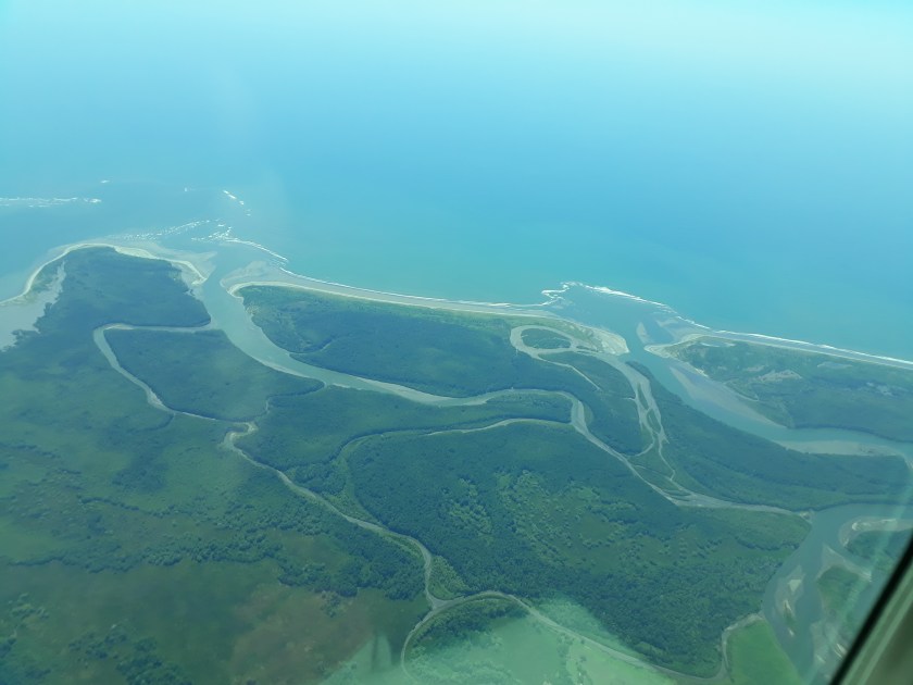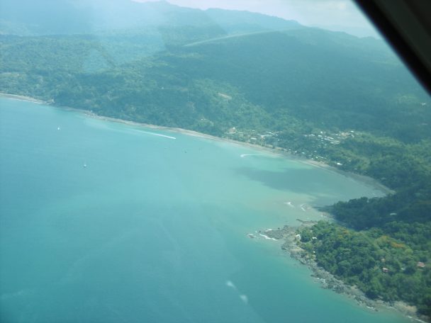 Le vol n’est pas direct, il fait un crochet vers le sud de la Péninsule d’Osa jusqu’à Puerto Jimenez traversant des zones boisées et aussi cultivées. Des fumées s’échappent des brûlis. Amusante image : la vue du dessus des plantations de palmiers à huile chaque arbre ressemble à un parasol. Aussi dans des champs secs et gris des rangées de plantes énigmatiques très écartées. Puerto Jimenez :un petit port avec une jetée. Ici, on sort du bateau à pied sec ! L’avion se vide. Des nouveaux passagers montent. Une jeune fille aux boucles blondes en cascade manie les bâtons orange pour guider l’atterrissage, s’occupe des valises et des listes de voyageurs. Elle semble être la seule employée. L’avion survole à nouveau la Péninsule d’Osa et passe au- dessus de la mangrove de Sierpe , le paysage est fantastique avec tous les méandres et les boucles qui parfois se bouchent et que la forêt n’a pas comblée. Au niveau de la mer, la turbidité est grande, on voit un tombolo se former, ailleurs des anneaux qui ressemblent à des attolls. L’avion file vers le nord au-dessus de la plage rectiligne vers Dominical je cherche Dominicalito avec son anse et ses îles, le fleuve Baru. Nous survolons un paysage de collines et montagnes. Les pistes tortillent reliant maisons et villages. Plus on s’éloigne du Pacifique, plus les prairies verdissent.