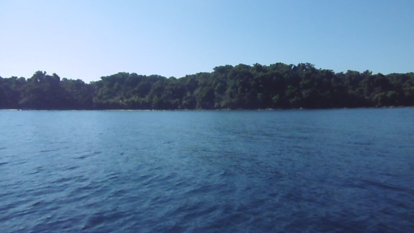 Embarquement pieds nus. Le bateau à auvent bleu saute dans les vagues. Quand on quitte la Drake Bay on découvre du large les resorts dispersés. Des roches noires, sans doute volcaniques, bordent la côte. Ils sont frangés d’écume blanche. Des arbres magnifiques s’étagent au flanc de la montagne ; Quand nous avons quitté Sierpe sur le fleuve dans la mangrove, j’avais imaginé que nous serions dans un pays plat ; pas du tout ; Les rives sont escarpées. Le voyage vers Corcovado dure un peu plus d’une heure. La côte plus lointaine est baignée dans la brume. Au loin, on devine la forme bizarre d’un rocher, tête ronde comme un champignon. Quand on s’en rapproche, on voit qu’il n’est pas seul mais accompagné d’aiguilles à l’allure étrange, un phénomène volcanique, sans doute.