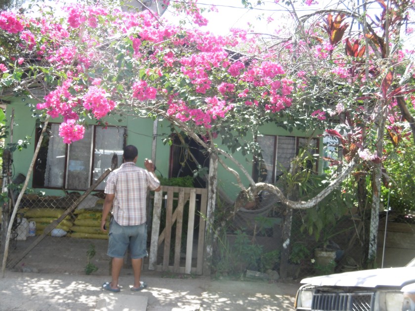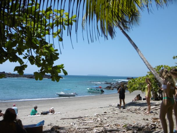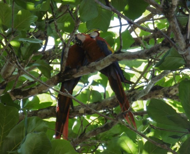 Les grands cris des perroquets rouges qu’on appelle lapas ou macaw, m’ont tirée du hamac. Ils sont très bruyants et traversent à tire-d’aile le ciel entre leur perchoir, un très grand arbre et les almendros, arbres à feuilles épaisses vernissées et arrondies om ils trouvent leur provende, des fruits verts « almendron » qui ressemblent à de grosses amandes très dures. Gretel, la femme de Johnny, m’appelle et me montre les macaws attablés. « Quand ils mangent, ils sont silencieux ». Soudain passe un perroquet solitaire « un veuf ou un juvénile qui n’a pas encore de compagne ; les perroquets vivent par paire et sont fidèles jusqu’à la mort » explique-t-elle. J’ai raté encore une fois la photo. Avec le Coolpix le zoom n’est pas assez puissant, ils sont tout petits. Quand au Lumix, il s’est éteint « pour surchauffe » justement quand je les avais bien visés. Je descends au bungalow, dégoûtée !