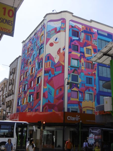 Nous suivons depuis un long moment l’Avenida Central qui devient piétonnière dans le Centre. On doit la contourner par l’avenida 2 puis par la 3. Le quadrillage des rues est très logique. D’un côté les avenidas paires parallèles à l’avenida central. De l’autre, les impaires. A angle droit les calleégalement numérotées ; Notre Hôtel Presidente s’ouvre sur la Calle 7. Sa façade toute bariolée est l’œuvre de l’artiste Sergio Guillen « Buscando el Gato » on le trouve ! (le chat).