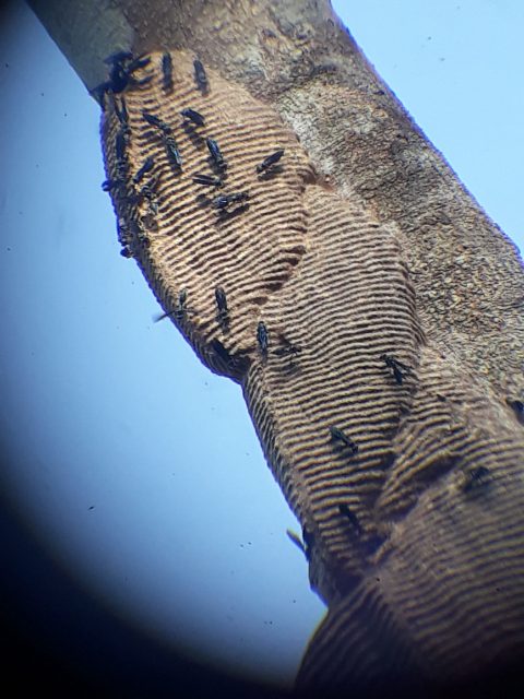 Nous passons près d’un nid de guêpes comme une boule, de guêpes blanches, les guêpes de lait, mieux vaut ne pas s’attarder, elles sont dangereuses. En haut d’un arbre d’autres guêpes ont construit un nid en forme de guitare qu’elles ventilent activement.