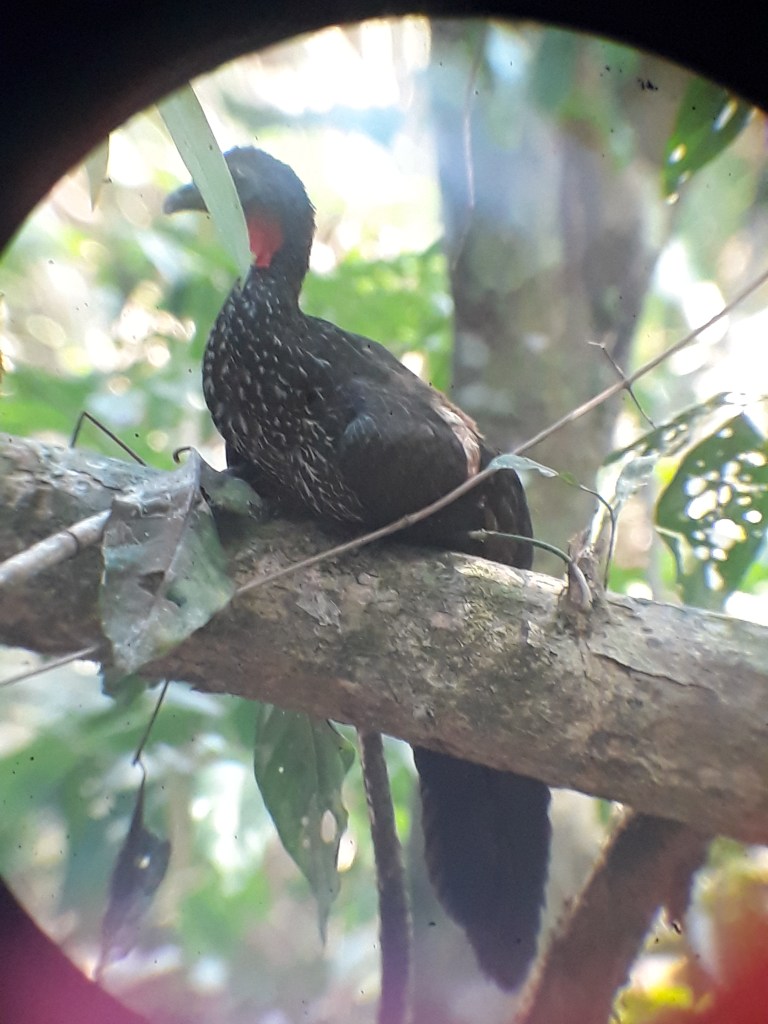 « Hum, Hum « un son très grave se fait entendre. On imaginerait un buffle au moins, Roy cherche dans les arbres. C’est une sorte de dindon avec un bec jaune qui perche sur les branches. Invisible, nous le verrons plus tard.