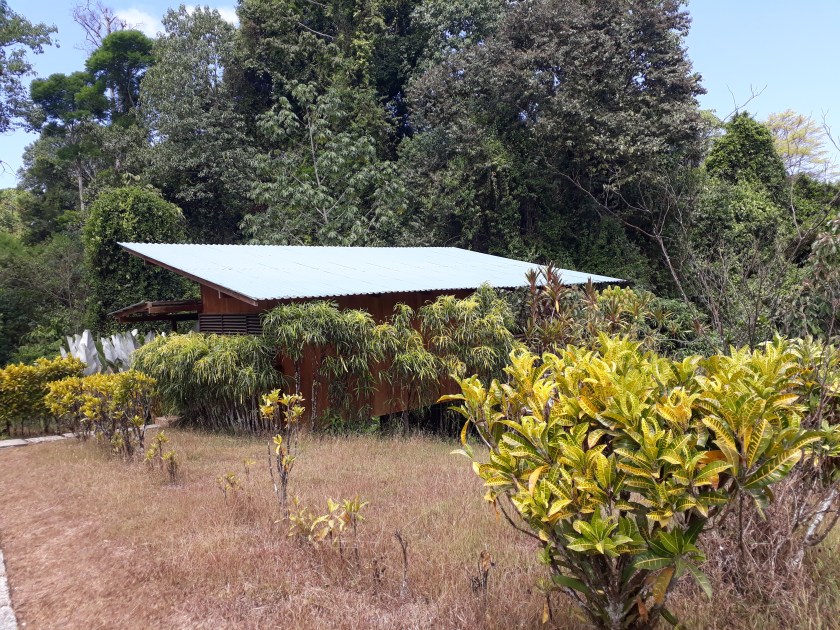 11h30 : Déjeuner au centre Sirena où l’ont pourrait aussi passer la nuit. Bâtiment vert, d’une architecture élégante, couvert de tôles dépassant largement en faisant des auvents en V emboités. Des petits lits enfermés par de moustiquaires font penser à des petites cages sont alignés. Le parquet est en beau bois vernis ; Il est interdit de circuler chaussé. Des étagères sont prévues comme à l’entrée d’une mosquée. C’est un endroit très agréable ; pour déjeuner, un buffet avec des salades, des fruits frais, des gâteaux et des sandwiches : un froid sorte de wrap, un autre chaud enveloppé dans une feuille de banane qui contient une pâte avec des ingrédients mystérieux. Roy explique que les feuilles de bananes sont les meilleurs lunch-box, conservant la fraîcheur mieux que les boîtes plastiques.