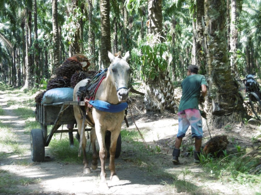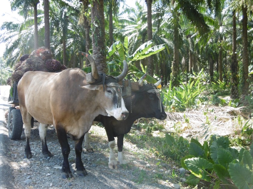 On récolte en ce moment les dattes rouges des palmiers à huile réusines en un régime serré. Deux garçons remplissent une charrette tirée par des bœufs. On a fini de les couper ? J’aurais bien voulu voir comment ; Les garçons sont d’accord pour être filmés. D’une maison voisine s’échappe de la musique cubaine qui sonorisera le film. Nous photographions les maisons de bois d’un village construite autour d’un terrain de foot herbu ; Elles sont le plus souvent basses mais certaines ont un balcon à l’étage.