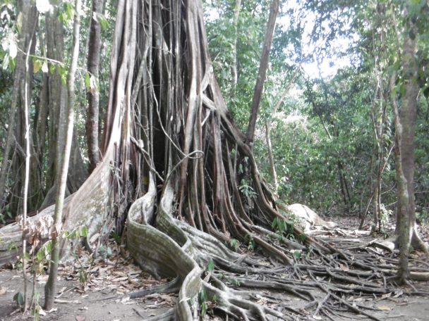 J’ai oublié de parler des arbres. Le plus grand est un géant d’Ail Noir, ainsi nommé à cause de l’odeur de ses fleurs. Impossible de l’approcher au moment de la floraison. D’autre géants sont les figuiers étrangleurs appelés aussi Matapalo . La jeune pousse vit d’abord en parasite sur un autre arbre, laissant pendre les racines avec une croissance du haut vers le bas et tuant l’arbre-hôte.