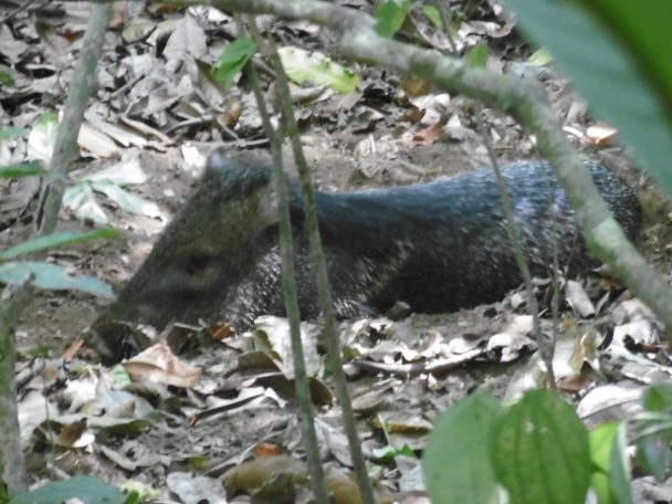 Roy « sent l’odeur du pécari » et le déniche dans un fossé plein de feuilles. La mère est entourée de nombreux petits qui ressemblent à des marcassins. Chez nous, trouver une laie et ses petits est une situation dangereuse. Ici, la mère semble habituée aux touristes.