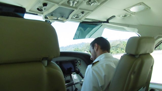 Notre avion atterrit : c’est un joli Cessna blanc décoré de rouge et bleu (couleurs du Costa Rica). Les ailes sont situées au-dessus de la carlingue, elles ne devraient pas gêner pour les photos. Il y a déjà du monde dans l’avion. Je choisis une place toute seule derrière le pilote et réserve pour Dominique la place sur le siège en face. Au hublot, il y a déjà une chinoise qui cède son siège pour s’asseoir au deuxième rang avec son compagnon. Les sièges en cuir crème sont très confortables, la visibilité parfaite. Un voyage de luxe !