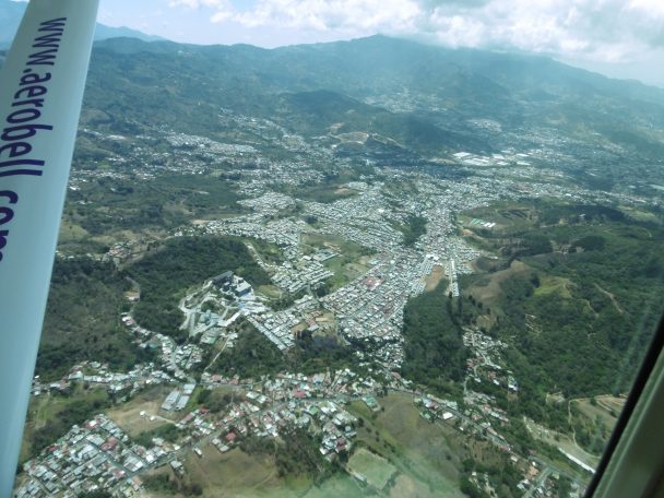 Des turbulences sont annoncées dans la Plaine Centrale. Les habitations se densifient autour de San José. Elles forment une mosaïque colorée de toits de tôle, rouges, verts, brillants ou rouillés. Du ciel on imagine un vaste bidonville. Cette impression est trompeuse : les maisons basses en ciment ne sont pas très coquettes mais confortables. Quelques immeubles dépassent les maisons. On distingue un beau club de tennis deux grandes piscines, un stade….L’avion atterrit sur un petit aérodrome. Chacun prend sa valise sur le chariot.
