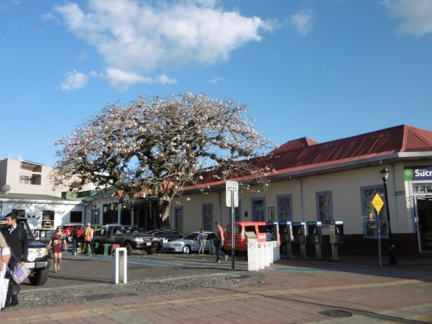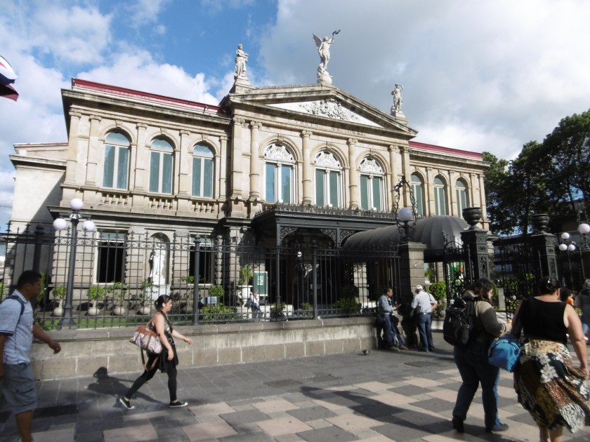 A peine les valises posées, nous partons à la découverte de San José ou plus précisément d’un restaurant pour le déjeuner, et d’un supermarché. L’Hôtel Presidente est idéalement situé à un bloc de la Place de la Culture où se trouve le Musée de l’Or et le Théâtre National. Nos fenêtres donnent sur l’Avenida Central. Comme il est un peu tard, on se contente d’empanadas de l’échoppe au coin de la rue, croustillantes, d’une pâte aérienne, remplie d’une sorte de crème au poulet. C’est léger, léger.