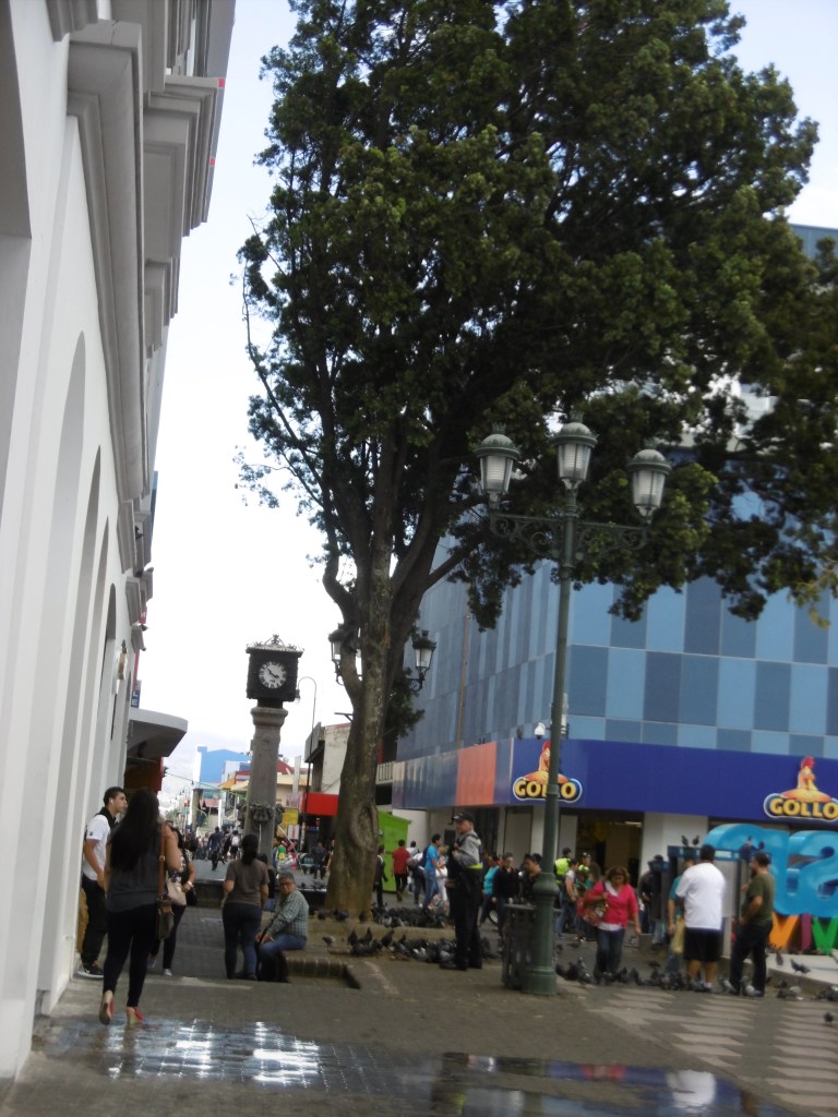 Autour de la Place de la Culture, de nombreux vendeurs de billets de loterie crient leurs nombres. Les feux rouges sont sonores et bippent quand les piétons peuvent passer. Dans les magasins on pousse un peu fort la sono. En ce moment ce sont les Soldes d’été. Au Costa Rica la saison sèche est appelée « l’été » même si on est au mois de mars. Rabais sensationnels sur les chaussures, les blouses et les maillots de bain. C’est joli. Nous sommes dans un quartier chic. Malheureusement nos valises sont pleines à craquer. L’Avenida Central est noire de monde.