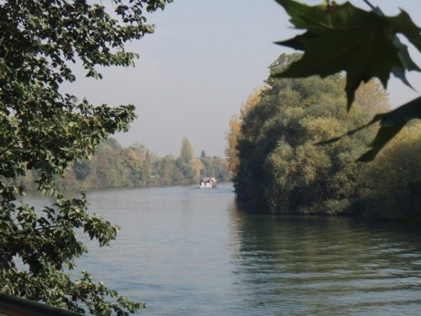 Sur la rive de l’autre côté du Bras de Marly, j’admire d’abord de très belles maisons, villas et presque des manoirs à Chatou et Rueil, puis les berges de Seine deviennent plus industrielles avec des montagnes de graviers, gravats, puis des énormes réservoirs de carburants. Je passe sous le viaduc de Carrières puis deux ponts ferroviaires. Les tours de Nanterre dépassent et au loin, se profilent celles de la Défense. C’est étonnant de se trouver dans un endroit si sauvage à proximité des tours!