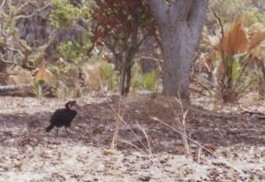 Au retour, nous trouvons un Calao, oiseau tout à ait extraordinaire, de la taille d’un dindon avec un curieux bec pointu qui ne peut pas se fermer. De gros barbillons rouges très renflés lui donnent des joues gonflées. Il se nourrit en creusant. Que tire-t-il ? Des racines ? Des insectes ? Des vers ? Même avec les bonnes jumelles, je n’arrive pas à discerner. Cette rencontre imprévue me charme presque autant que celle des lions.