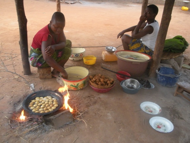7 heures, nous allons voir ce qui se passe de l’autre côté de la cour où les femmes ont fait un feu de bois. L’une d’elles est accroupie. Elle prend des petites boules d’une pâte grisâtre de farine de haricots et de soja. Elle et fait frire des beignets dans une bassine d’huile.il y en a vraiment beaucoup.