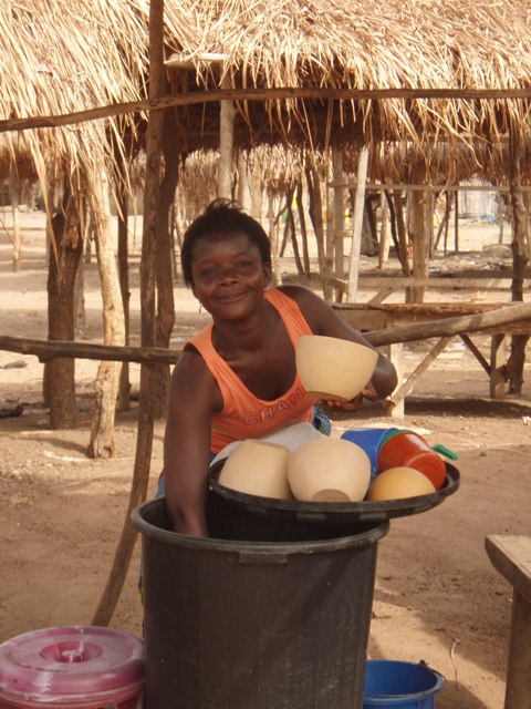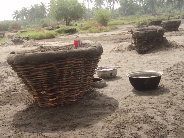 Des femmes extraient le sel du sable par un procédé tout à fait original. Elles remplissent de sable de gros paniers sur lesquels elles versent l’eau de la lagune : la saumure s’écoule par un petit tuyau dans une bassine que les femmes font bouillir sur des foyers de terre qu’elles alimentent avec du bois. Comme ce sont les vacances, les enfants apportent des petits rondins sur leur tête. On ne récolte le sel qu’en saison sèche. A la saison pluvieuse, les eaux monteront et inonderont la place.