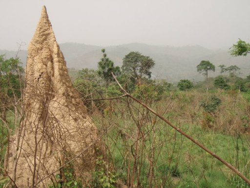 Du Campement on peut aller au sommet du Mont Kloto en voiture. Apollinaire décide qu’il fait chaud et veut abréger la promenade que je réclame vivement. Pour ma punition, il marche au pas de charge. Pour retrouver mon souffle je photographie une termitière. Le mont Kloto n’est pas boisé. Son sommet est herbu. C’est vrai qu’à 3 heures de l’après midi ce n’est pas la balade la plus agréable. J’en profite pour apprendre comment on fait l’huile de palme : l’huile rouge pour la cuisine devient en vieillissant l’huile noire. Mon guide cueille une sorte de datte orange qui pousse en régime à la base de la touffe de feuilles.