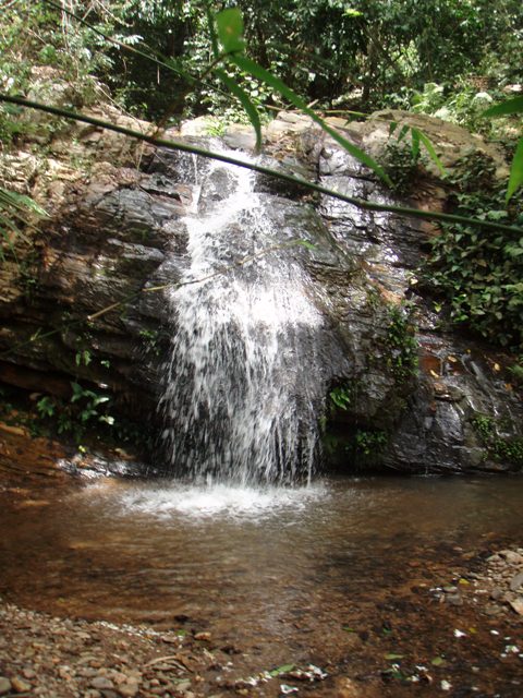 Nous arrivons donc sans encombre à une jolie cascade qui retombe dans un petit bassin ? Pour les exploits nautiques c’est u n peu trop petit. Pour la douche glaciale, je m’y reprends à 3 fois ? Une cabine a été installe à l’écart. Au milieu de sa toile, une araignée de bonne taille guette sa proie, je me change à distance.