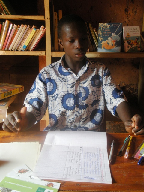 Tous les enfants nous escortent. Symplice, l’ancien bibliothécaire, a eu son bac et a laissé son poste à Gérard, 16 ans, en 3ème, qui tient impeccablement les cahiers de présence et des visiteurs. Il n’y a pas de cahier de prêt puisque la lecture se fait sur place dans une petite salle où trois bancs sont adossés aux murs.