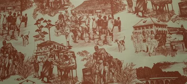 Les papiers peints, de style Toile de Jouy apporte un contrepoint en donnant une image du rapport de domination des autorités coloniales sur les indigènes. Achats, dons, échanges ne pouvaient s’envisager sereinement. Des vidéos documentent les Contre-enquêtes menées au Bénin, à Dakar, au Mali ou à Djibouti.