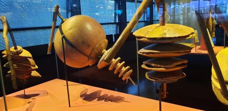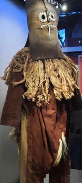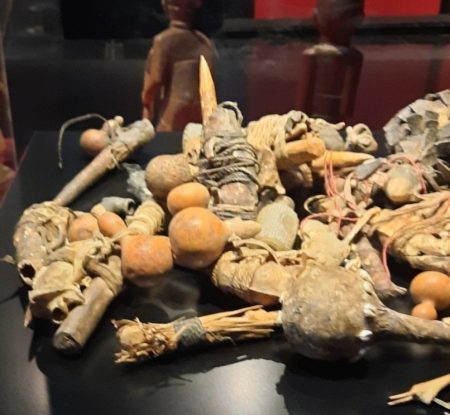 On pourrait se contenter de déambuler parmi les vitrines, lire les cartels, être dépaysé par les coutumes, les formes…les matières. Admirer les calebasses gravées, décorées, deviner les usages.