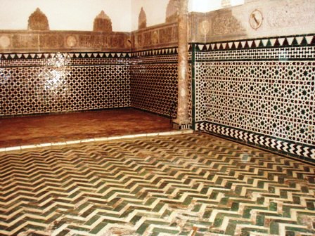Dans le Dormitorio de los Reyes Moros les zelliges vert et blancs donnent une impression de calme, de repos et de fraîcheur avec des motifs en zigzag évoquant l’eau..