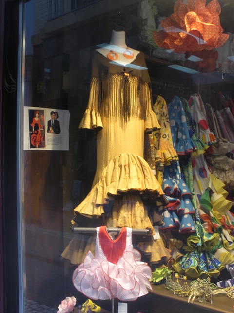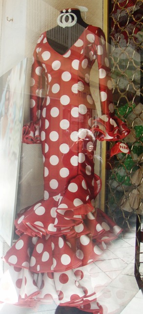 Pour Feria la fin de la semaine, les chaussures exposées sont toutes sur le même modèle : des escarpins à talon large et à bout rond avec une bride comme les chaussures des petites filles autrefois. Toutes les couleurs sont proposées mais c’est le rouge qui domine à pois blancs ou noirs, c’est selon…Dans les magasins d’habillement c’est le « traje de flamenca » qui est exposé en vitrine : robe collante et décolletée avec des volants. Toutes les couleurs sont admises (encore une nette préférence pour le rouge) à condition qu’il y ait des volants.