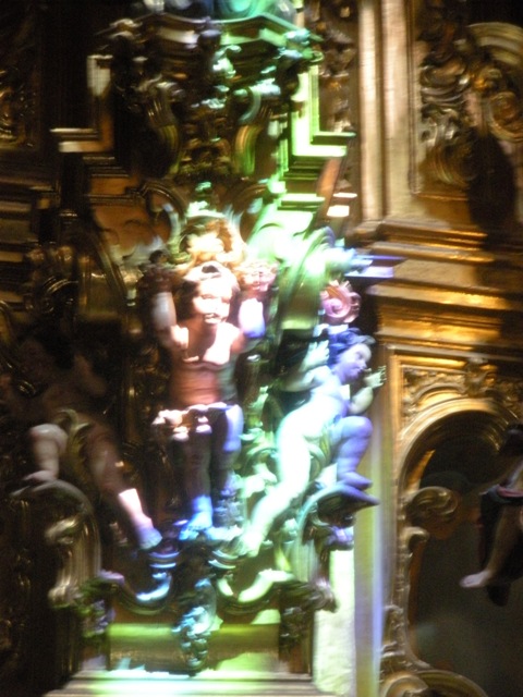 A l’intérieur, nous sommes étonnées par les dimensions, la clarté, surtout par les couleurs et les dorures. C’est baroque, très baroque même rococo. Trois retables se concurrencent en baroquisme et même en baroquiade. Baroquissimes, les putti ont été engraissés à la Rubens. Les nuages et nuées s’accumulent. Dieu le Père est debout sur une pyramide de têtes. Les saints de bois sont habillés de velours et s’élèvent dans des grottes. Il y a même un âne de taille réelle (aussi réaliste que le faux cheval de la boutique d’El Rocio). Comme à Vienne, comme à Palerme, c’est toujours trop, trop abondant, trop doré, trop nuageux… Cependant, le baroque espagnol garde une dimension tragique qu’il n’a pas en Sicile.