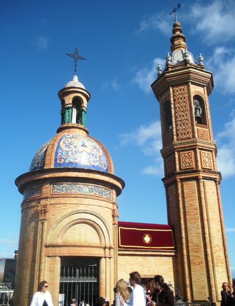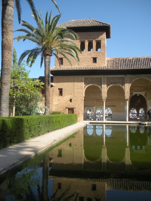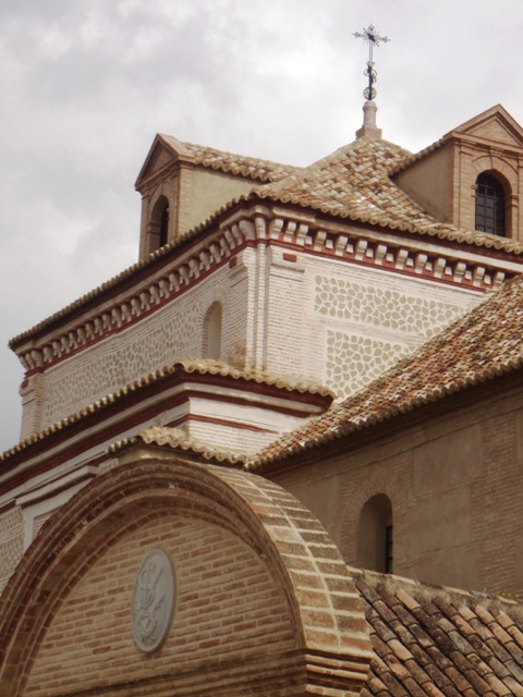L’église est très simple, blanche. Un peu plus loin se trouve la mosquée moderne (ouverte en 2003). Nous pouvons nous promener dan ses jardins installés sur la terrasse face à l’Alhambra. Jolis bassins en céramique bleue en forme d’étoile, sûrement rafraîchissants en été. La salle de prières est sobre, une épaisse moquette rouge mais peu de décor. Le minaret est coiffé d’un toit en pyramide. Rien ne le distingue du clocher de l’église toute proche si ce n’est que la girouette est remplacée par trois grosses boules de cuivre.