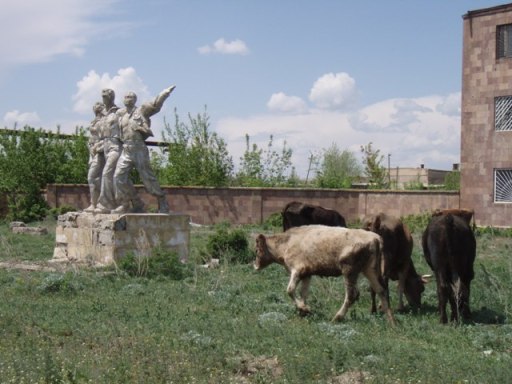 Nous garons la voiture sur une grande place occupée par de nombreuses banques et descendons la rue piétonnière qui conduit à la place de la Liberté où il y a la Mairie – toute neuve crème – et deux églises. L’une d’elle complète et très noire, l’église des 7 douleurs avec sa coupole au toit pointu tombé en 1988, en face la Cathédrale entourée d’un échafaudage. Un panneau raconte que pendant la période communiste, la Cathédrale était une salle de concert. Il est aussi expliqué que les clochers encaissent les secousses et protègent l’église. Dans le cas de la Cathédrale cela n’a pas dû aider, les dégâts furent spectaculaires : une photo de 1988 montre un pan de mur à la place du clocher. En 25 ans les chantiers se succédèrent et s’arrêtèrent faute de crédits. L’extérieur est pratiquement complètement remonté. Tatev, la sœur de Jack nous en racontera un peu plus : le groupe de statue qui occupe le centre de la place représente le roi Mamikonian entouré de ses guerriers, au 5ème siècle . Ce soir Vartan était censé donner son nom à la place, selon le désir du maire qui portait le même prénom. Tatev nous montre aussi le Cinéma Octobre joliment rénové.