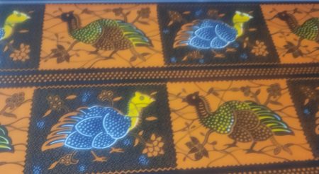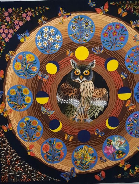 suspendus le Kalamkari au cyprès (voir ci-dessus) imprimé au bloc, découpé, appliqué sur un fin voile de coton puis rebrodé au point de chaînette pour dessiner les deux paons, deux tigres et des antilopes.