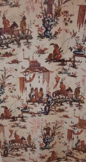 La visite commence dans l‘Antichambre, exemple parfait de métissage : le mobilier, la cheminée et ses bûches, le lampadaires sont tapissée de cotonnade aux motifs et couleurs indiennes . Tendues, au-dessus de nos têtes, des lanières de tissu figurant la toile d’une tente moghole. Sur le mur d’entrée aux arcades indiennes on a tendu de la toile de Jouy aux motifs bucoliques, images de France…métissage inversé.