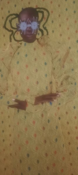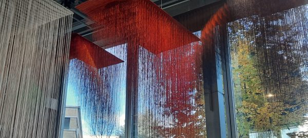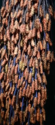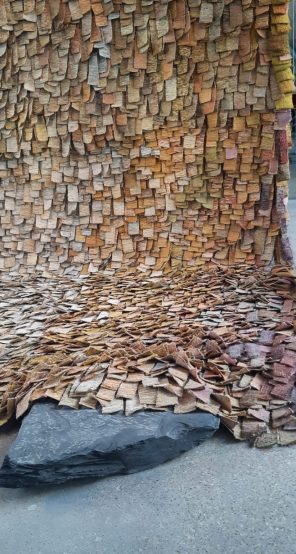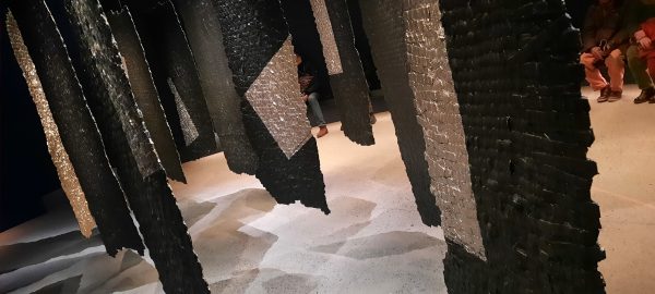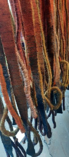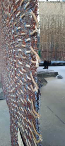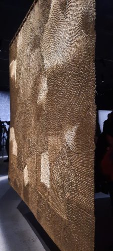 et au plafond des fils d’or tendus d’un tissage d’une finesse évanescente tandis qu’au milieu de la salle Lakshmi Modhavan CLICa installé une 96 navettes de bois chargées de fil d’or sauf certaines contenant des cheveux noirs de son fils, symbolisant la transmission de la tradition et de son savoir de tisseuse. Le tissage à la main de ces fils d’or est si fin que des mots se lisent par transparence EVERYBODY /ANYBODY/NOBODY: