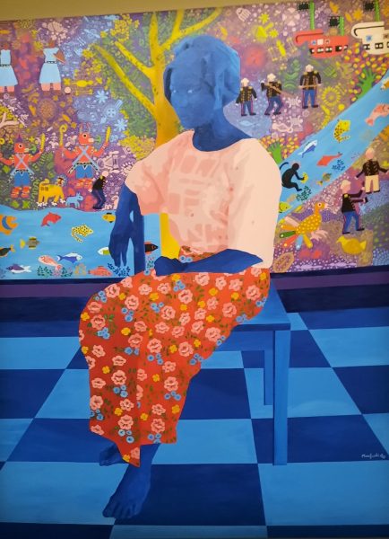 Le décor est une immense tapisserie à fond vert et motifs végétaux The flower we grew de Rithika Merchant, Chanakya, CLIC