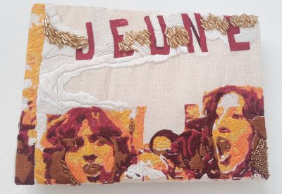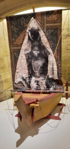 La salle suivante est blanche, blanche comme la dentelle d’Alençon, ou la mousseline brodée. Dentelle de France, broderie indienne, s’épousent s’échangent. Le blanc est la couleur de deuil en Inde. Une merveilleuse installation Blueprint of Before and After de Sumakhsi Sing CLIC est composée de très fines broderies sur des modèles végétaux, feuilles de lotus ou d’herbes aquatiques suspendues par des fils presque invisibles. Légèreté, transparence. Les broderies étaient sur un support que la brodeuse a dissous chimiquement pour qu’il ne reste que ces nervures. la disparition de la matière pour ne garder que le squelette correspond à ce thème du deuil. A la fragilité de la vie. Je suis revenue contempler cette oeuvre qui me plaisait beaucoup à la fin de la visite. De la fenêtre venait une lumière rose du coucher du soleil éclairant les motifs et leur donnant un aspect nouveau.