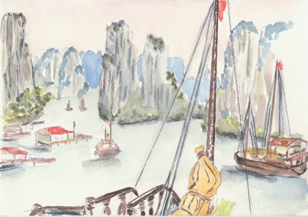 La baignade nous a bien rafraîchies. Quand nous remontons à bord la jeune femme a arrangé joliment les colliers de perles. Si elles sont véritables, elles ne sont pas chères. Si elles sont fausses, c’est une belle arnaque. De toutes les façons, je ne sors pas emperlousée. Il n’est pas question que j’en achète. Dominique se désintéresse de la question. Aucune aide à attendre de la part de Dong il ne veut pas empêcher ses compatriote de faire des affaires. Pour trouver une sortie j’achète des cartes postales dont nous n’avons aucun besoin à 3$ ce qui est déjà un bon prix L’épisode des perles jette un froid, je me justifie auprès de Dong. A 16H comme prévu, la jonque revient au port. Quelques éclairs de chaleur zèbrent les nuages. L’orage n’éclatera pas au grand regret de Dominique. Rien n’aura terni cette journée en tous points parfaite.
